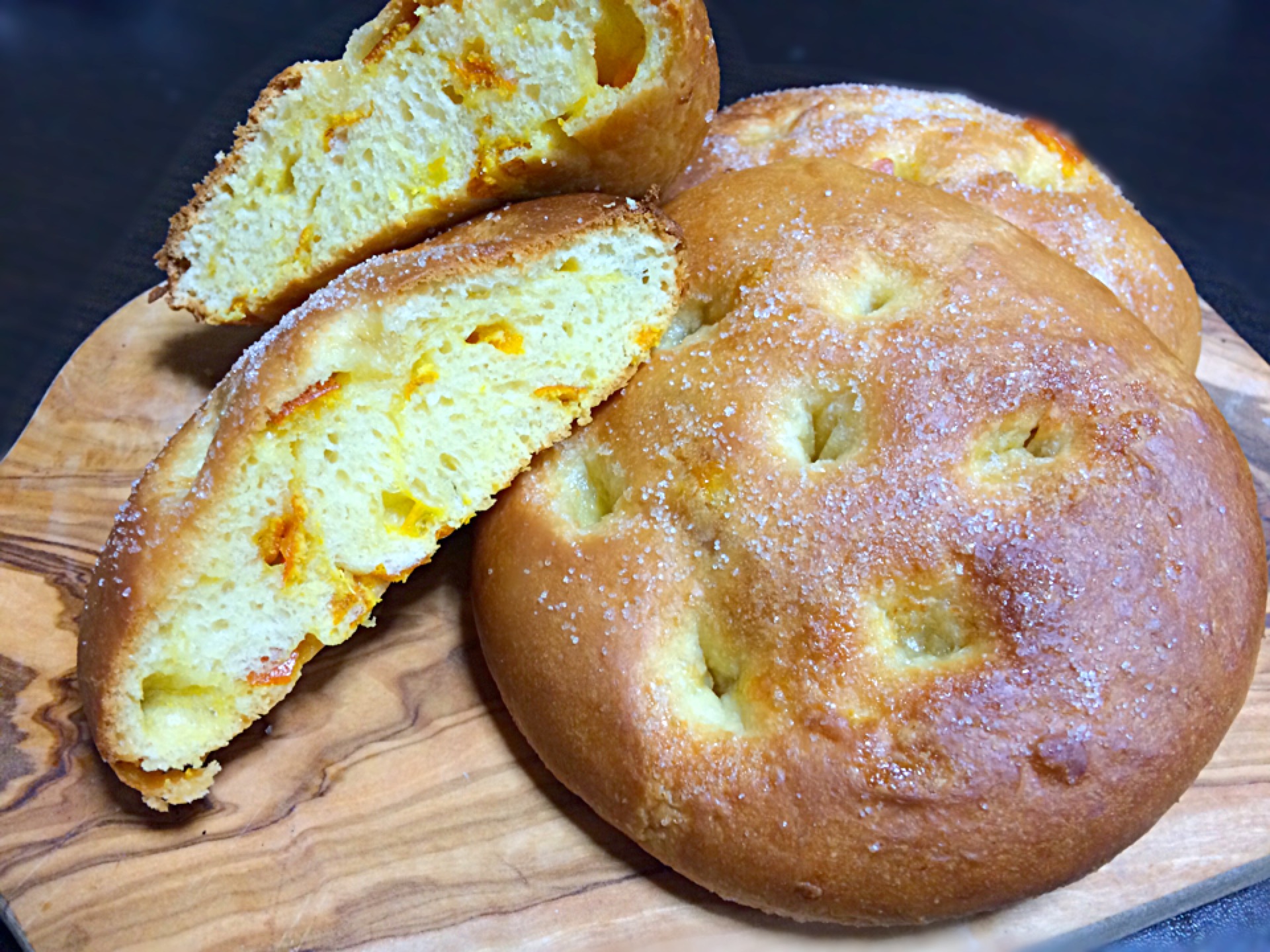 先日仕込んだみかんジャムを生地に混ぜ込み、バターシュガーをトッピングして焼き上げます。しっとりな生地の中に、オレンジピールとはまた違ったみかんの風味が広がります。冬の香りのするパンです。